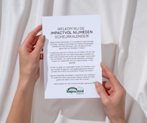 Na die eerste editie wilde Judith meer. De doelgroep werd breder, van studenten naar de hele stad, en zo ontstond de Impactvol Nijmegen scheurkalender. Elke dag bevat een mix van maatschappelijke thema’s, met bijvoorbeeld lokale weetjes, quizvragen over de historie van Nijmegen en inhakers op speciale dagen. Maar ook een podium voor lokale impactondernemers zoals Bakkerij Koekkoek, die via de kalender hun verhaal kunnen delen met de stad.